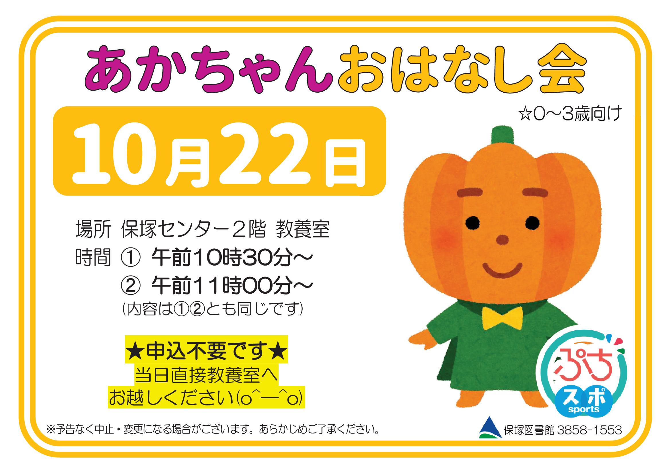 あかちゃんと保護者のための楽しいおはなし会です。絵本の読み語りや、おうちでも簡単にできる手遊び、あかちゃんも大好きなパネルシアターをおこないます。お子様との憩いの時間をお過ごしください。10時30分からと11時からの2回実施しますので、ご都合に合わせてご参加ください(内容は同じです)。10月22日(水)のあかちゃんおはなし会は「ピラティス体験」も同時開催! 初めての方でも気軽にできる内容です。みんなで体を動かしましょう♪