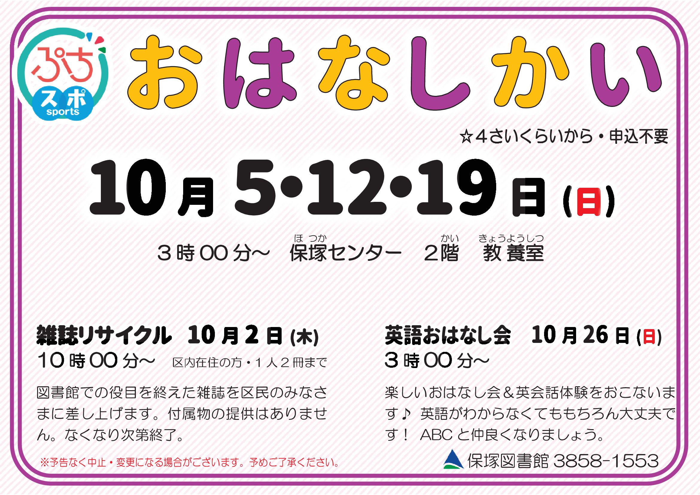 「図書館に行きたいけれど、子どもが泣いたらどうしよう…」そんなご心配をもつ保護者の皆様! 毎月第1・2・3・5水曜日の10:30~12:00、図書館は「あかちゃんタイム」になります。お子様が少しくらいにぎやかでもOK!な時間帯です。あかちゃんや小さなお子様と一緒に図書館をご活用ください。(第4水曜日の10月22日は保塚地域学習センターキッズルームをあかちゃんサロンとして開放します)