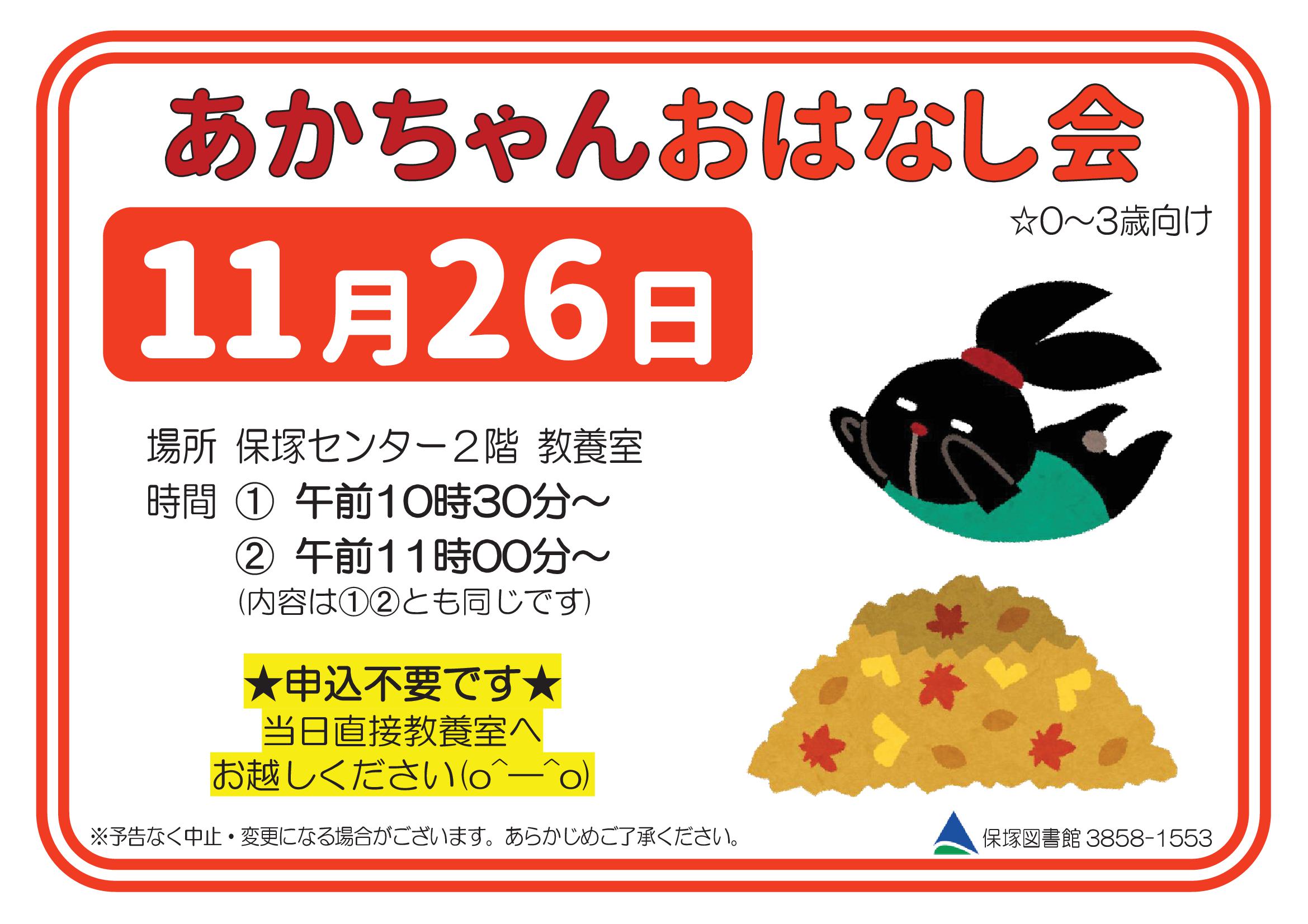あかちゃんと保護者のための楽しいおはなし会です。絵本の読み語りや、おうちでも簡単にできる手遊び、あかちゃんも大好きなパネルシアターをおこないます。お子様との憩いの時間をお過ごしください。10時30分からと11時からの2回実施しますので、ご都合に合わせてご参加ください(内容は同じです)。(※予告なく変更・中止になる場合がございます。あらかじめご了承ください)