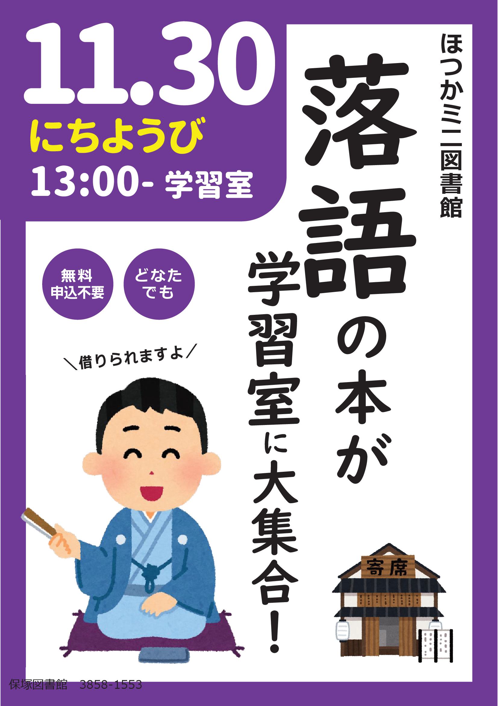 11月30日(日)の「明治大学落語研究会 保塚寄席」の開催にあわせて、落語の本を中心に、読んで楽しいオモシロ本をたくさん展示します。その場で読むもよし、借りて家で楽しむもよし。出入り自由ですので、保塚寄席や図書館にお越しの際はぜひお立ち寄りください。足立区のすべての図書館から本を集めるので、ふだんは保塚図書館で見かけない本との出会いもありますよ。(※予告なく変更・中止になる場合がございます。あらかじめご了承ください)