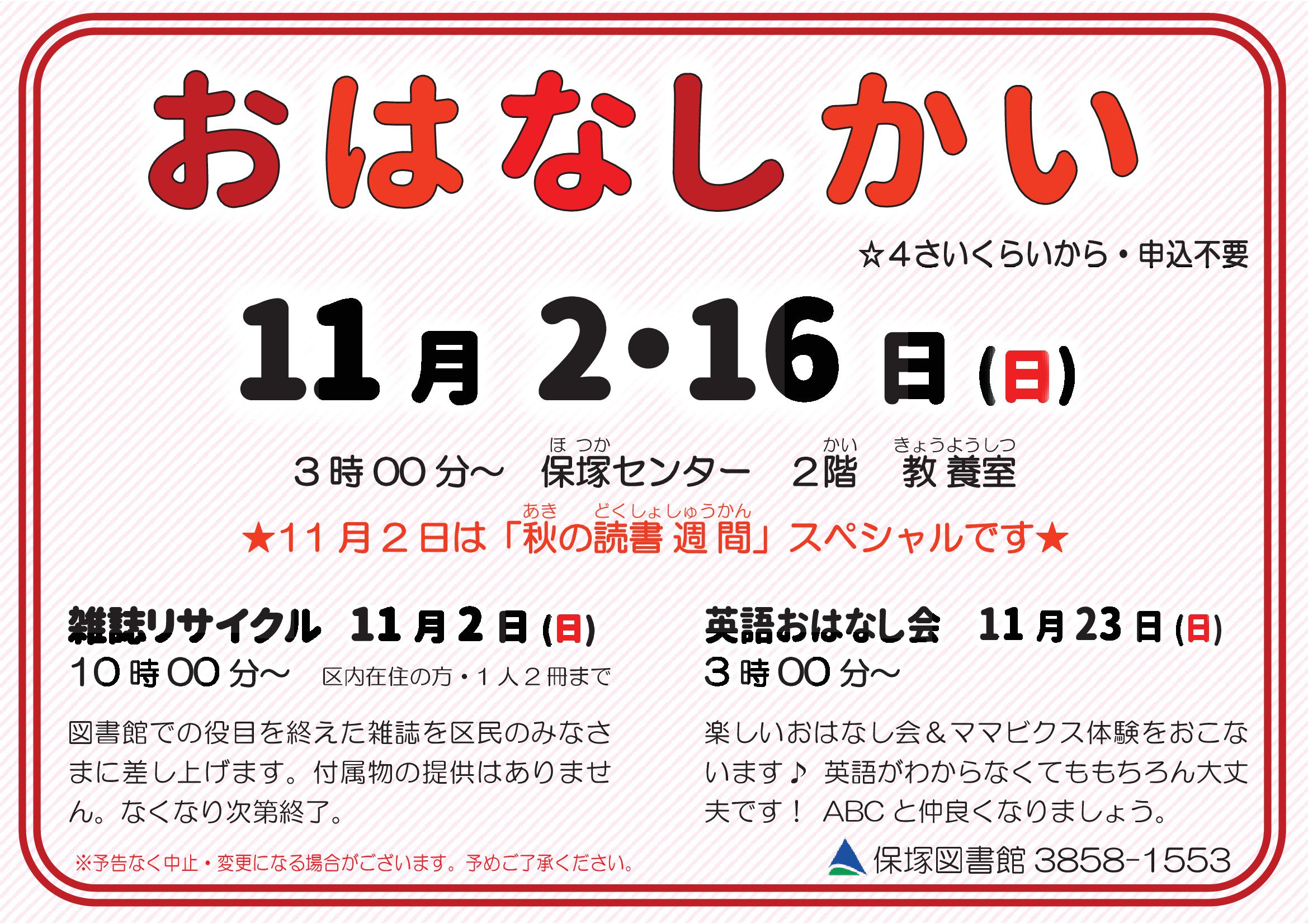 4歳くらいのお子様から小学生向けに、絵本・紙芝居の読み語りや手遊びをおこないます。11月2日(日)は「秋の読書週間スペシャル」! 特別なプログラムをお楽しみに♪ おうちでも楽しめるように借りられる絵本もたっぷり用意します。おともだち、家族みんなで季節の絵本や名作絵本を楽しもう!(定員18名程度)(※予告なく変更・中止になる場合がございます。あらかじめご了承ください)