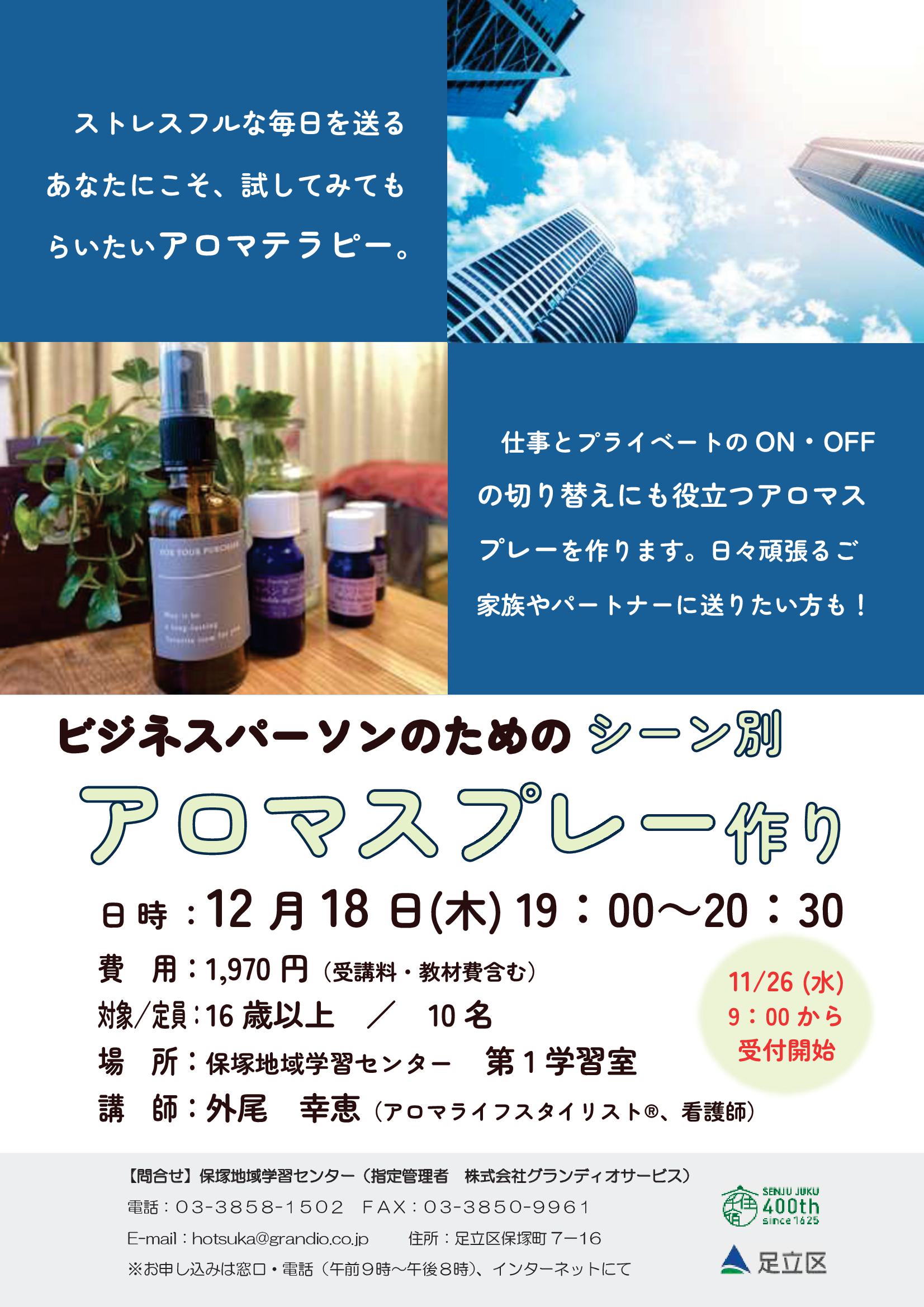 仕事から受けるプレッシャー、人間関係による精神疲労など、ストレスフルな毎日にアロマテラピーを試してみませんか。仕事とプライベートの切り替えにも役立つ、シーン別の3つのアロマスプレーからお好きなもの1つ選んで作成します。家族やパートナーに送りたい方の参加もお待ちしています。