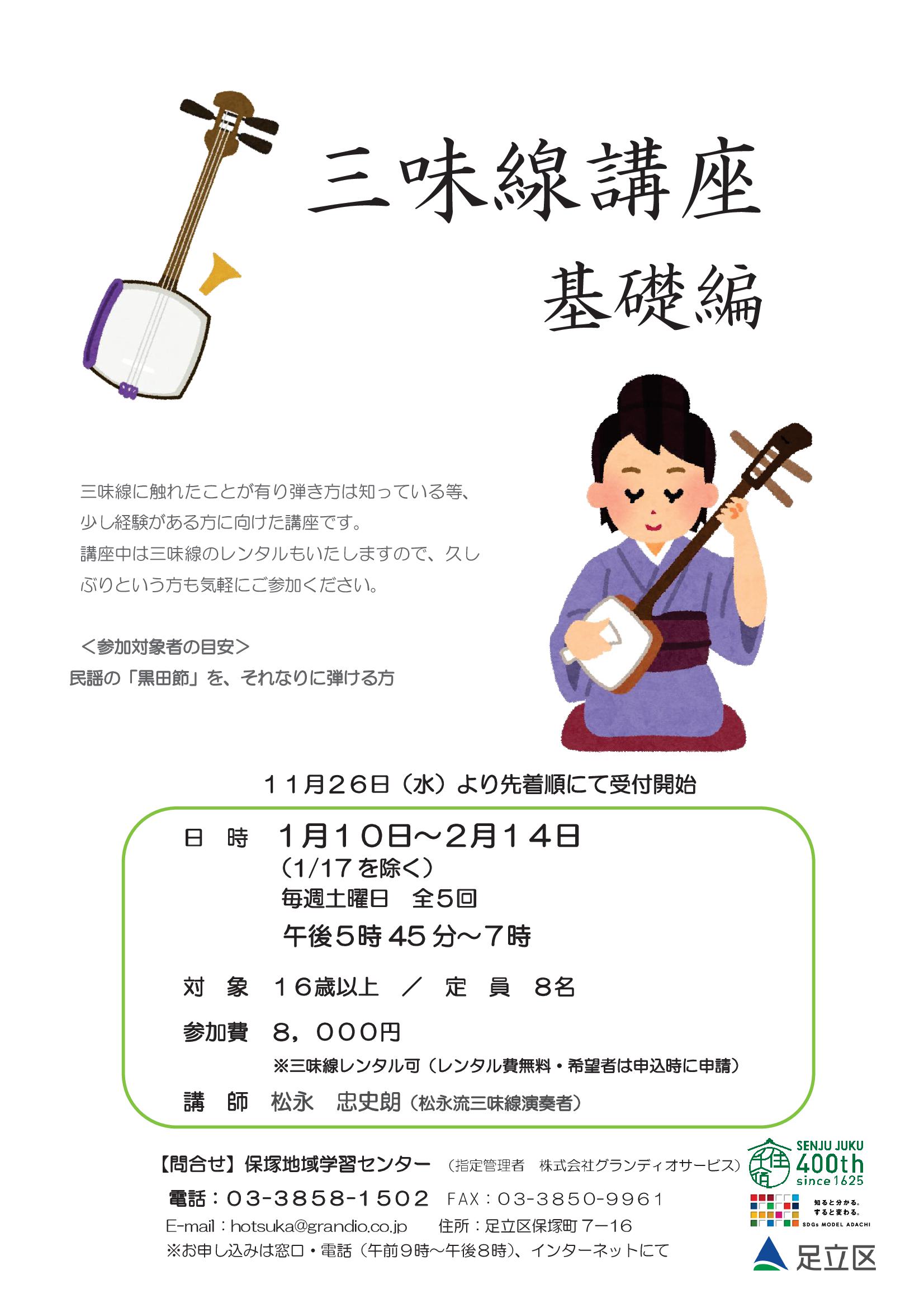 一度は三味線を学び、弾き方は分かる、日本古謡「さくらさくら」をそれなりに弾ける、程度の方を対象とした、更にステップアップを目指す三味線講座です。レンタル費無料で三味線の貸出も行います(貸出は講座中に限り、持ち帰りはできません)。
