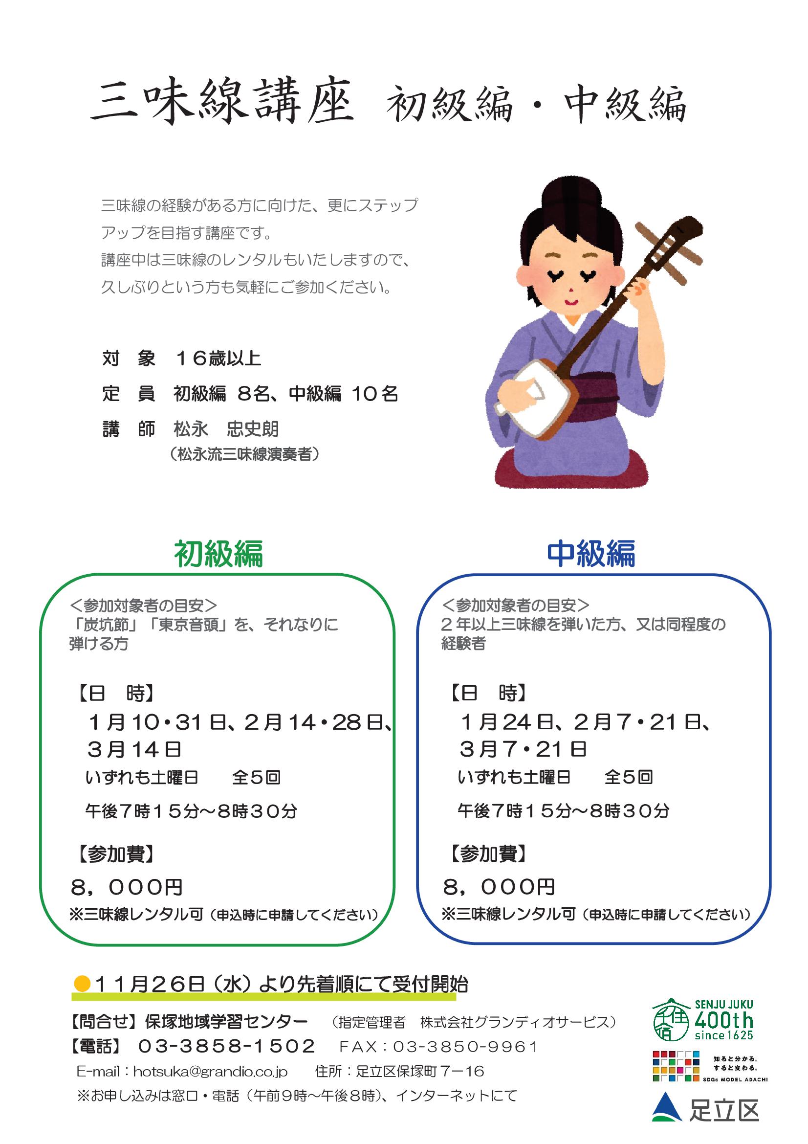 既に三味線を学んでいる方を対象とし、「初級編」講座から更にステップアップを目指す三味線講座です。対象者の目安として「一年以上三味線を弾いているか同程度の経験がある方」としています。三味線のレンタル(無料)もございます(貸出は講座中に限り、持ち帰りはできません)。