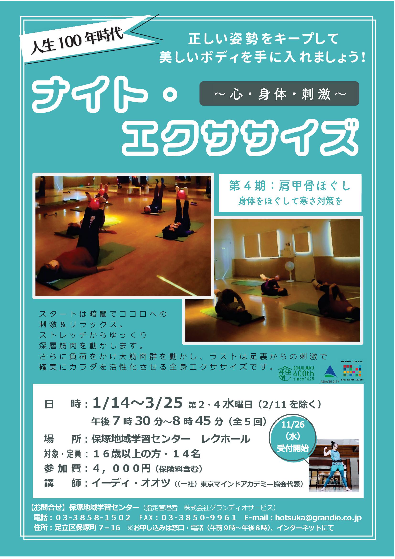 リラクゼーションやストレッチの後、筋肉に負荷をかけて動かし、身体全体を活性化させるエクササイズです。1~3月は「肩甲骨」を中心に鍛えていきます。