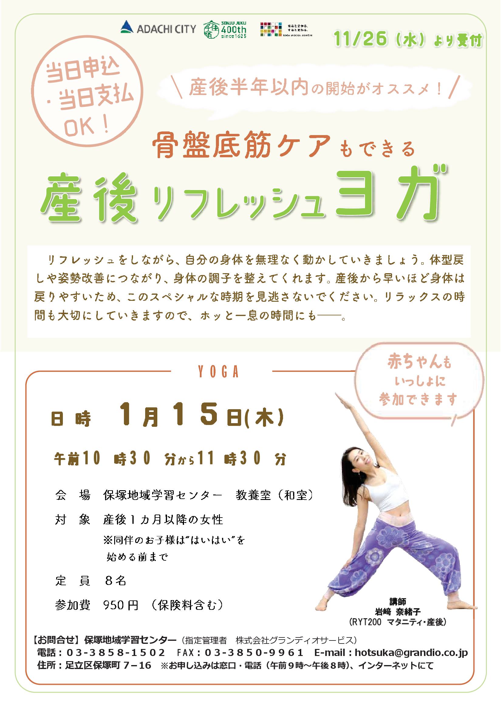 産後の母親のためのヨガを行います。将来のために鍛えておくと良い「骨盤底筋」のケアを中心に、日々の疲れを癒やせる内容を行います。