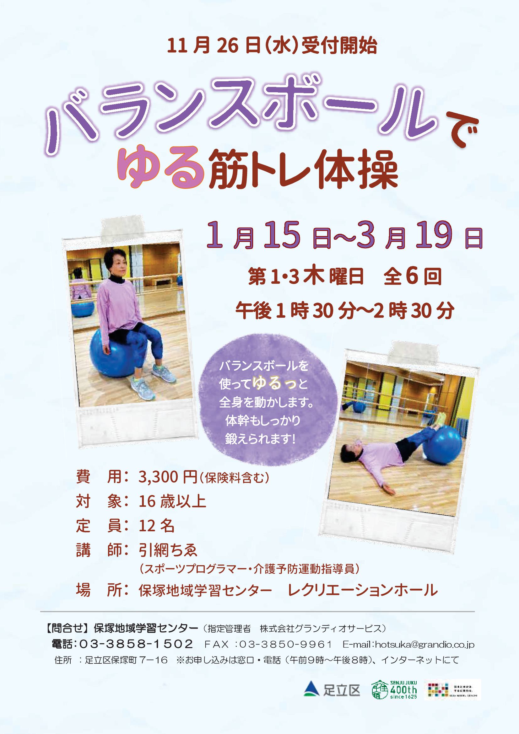 バランスボールを使って「無理せず楽しく、きつくない筋トレと体操」をコンセプトにした運動を行います。バランスボールの他にもセラバンドを用いて筋力アップのためのトレーニングやリズム体操・ウォーキング等も取り入れます。