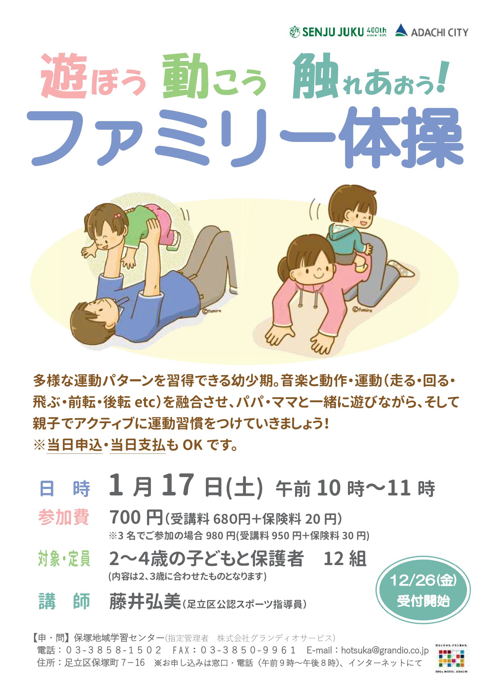 家族のコミュニケーション・スキンシップ・運動不足解消を目的に開催します。内容は2、3歳向けとなります。参加者以外のご家族の見学も可能です(撮影禁止)。