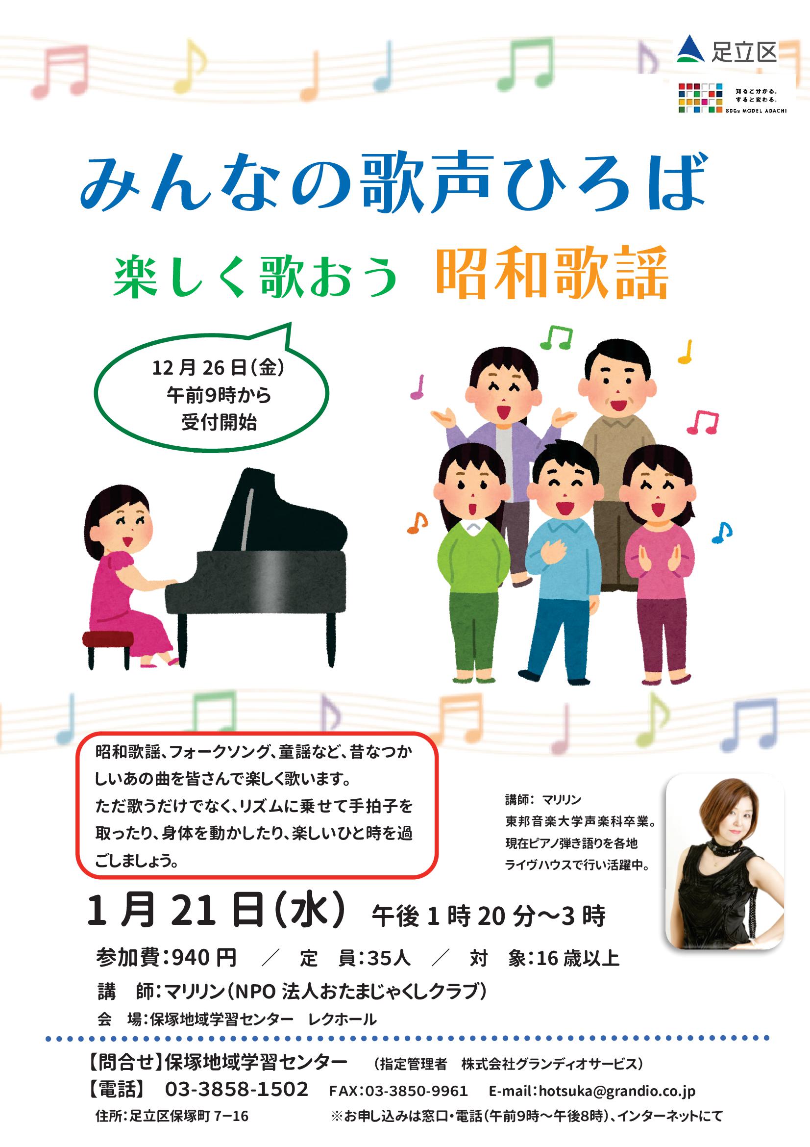 講師のマリリン先生と、参加者の皆さんで一緒に、懐かしい昭和歌謡を歌います。