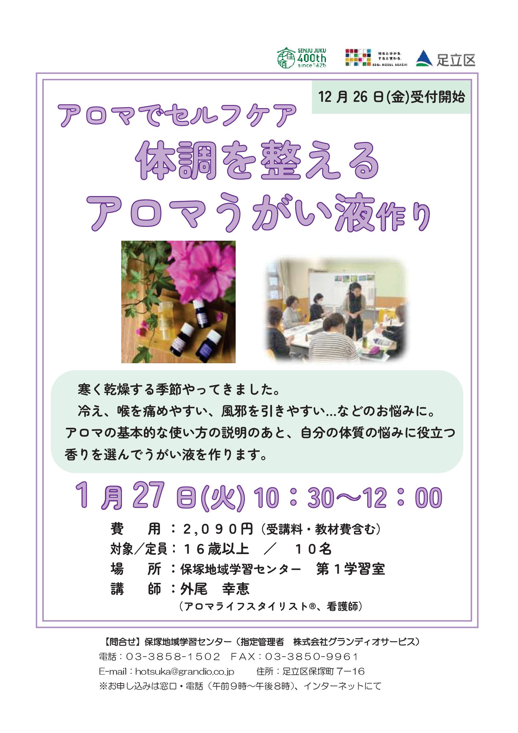 冷え、喉を痛めやすい、風邪を引きやすいなど、乾燥する季節のお悩みにぴったりのアロマ講座です。自身の体質に合わせた香りを選んで、うがい液を作ります。初めての方でもアロマの楽しみ方が分かる内容です。