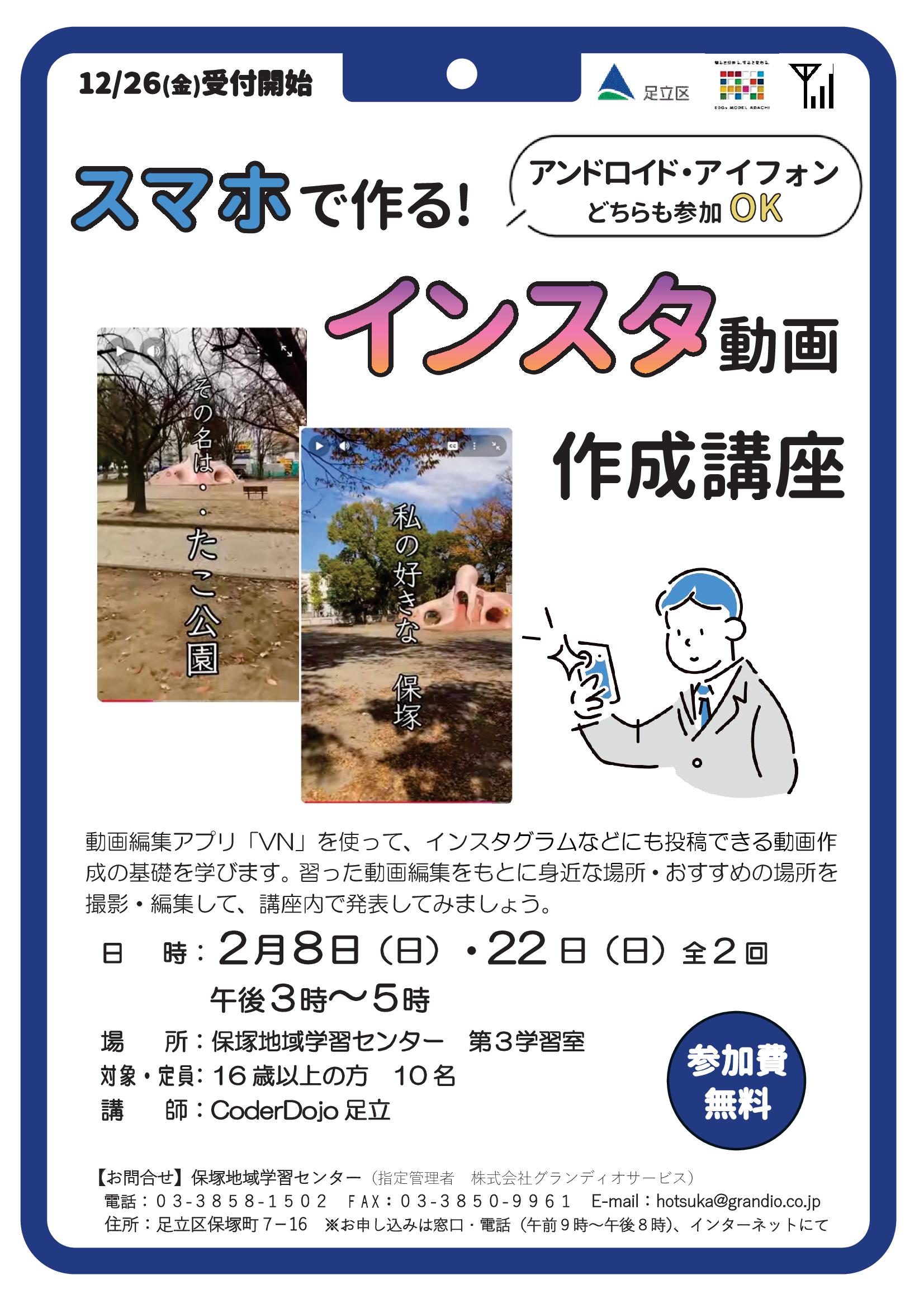 スマホでの動画撮影と編集の基礎を学び、出動画編集アプリ「VN」を使って、インスタグラムなどにも投稿できる動画作成の基礎を学びます。習った動画編集をもとに身近な場所・おすすめの場所を撮影・編集して、講座内で発表してみましょう。