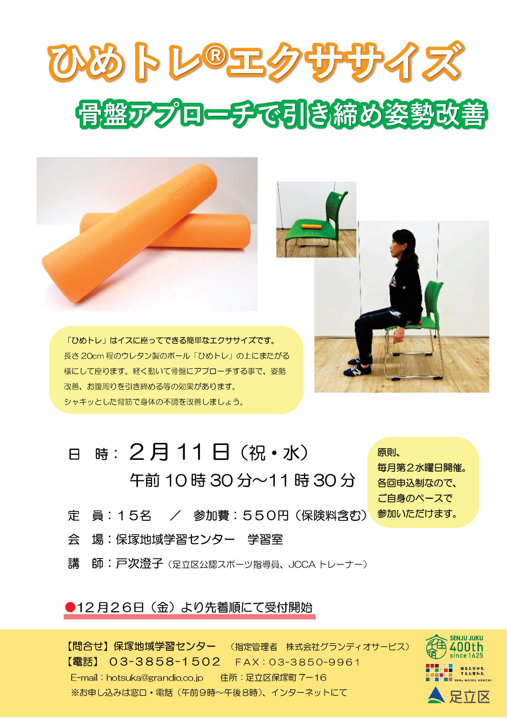 マット材質で長さ20cm程度、幅4cm程度の円柱形のポールを使用した簡単なエクササイズです。ポールを椅子の上に置き、またがるようにして腰かけ、骨盤周辺の筋肉に刺激を与えて、身体の引き締め効果などを狙います。