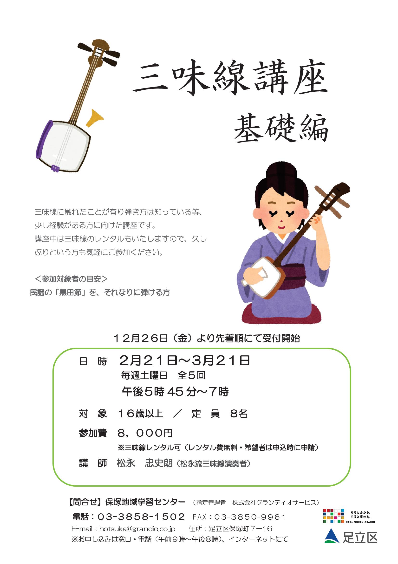 一度は三味線を学び、弾き方は分かる、日本古謡「さくらさくら」をそれなりに弾ける、程度の方を対象とした、更にステップアップを目指す三味線講座です。レンタル費無料で三味線の貸出も行います(貸出は講座中に限り、持ち帰りはできません)。