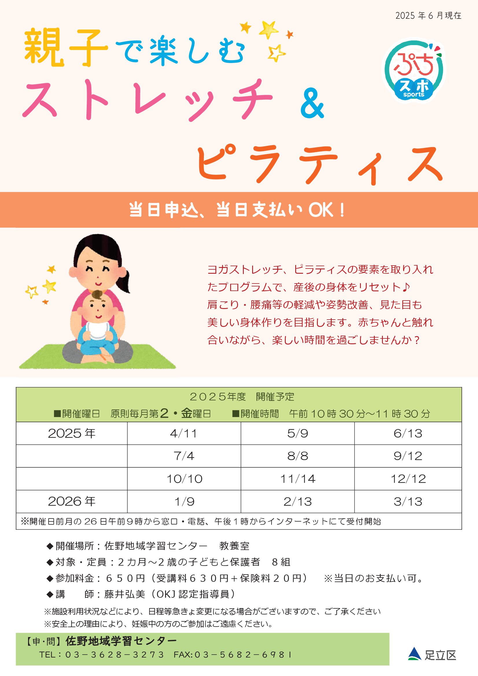 ※初回参加時には、「親子で楽しむストレッチ&ピラティス」または「産後ママのためのタッチケア&フィットネス」講座参加時に使用できる250円オフクーポンを差し上げます。