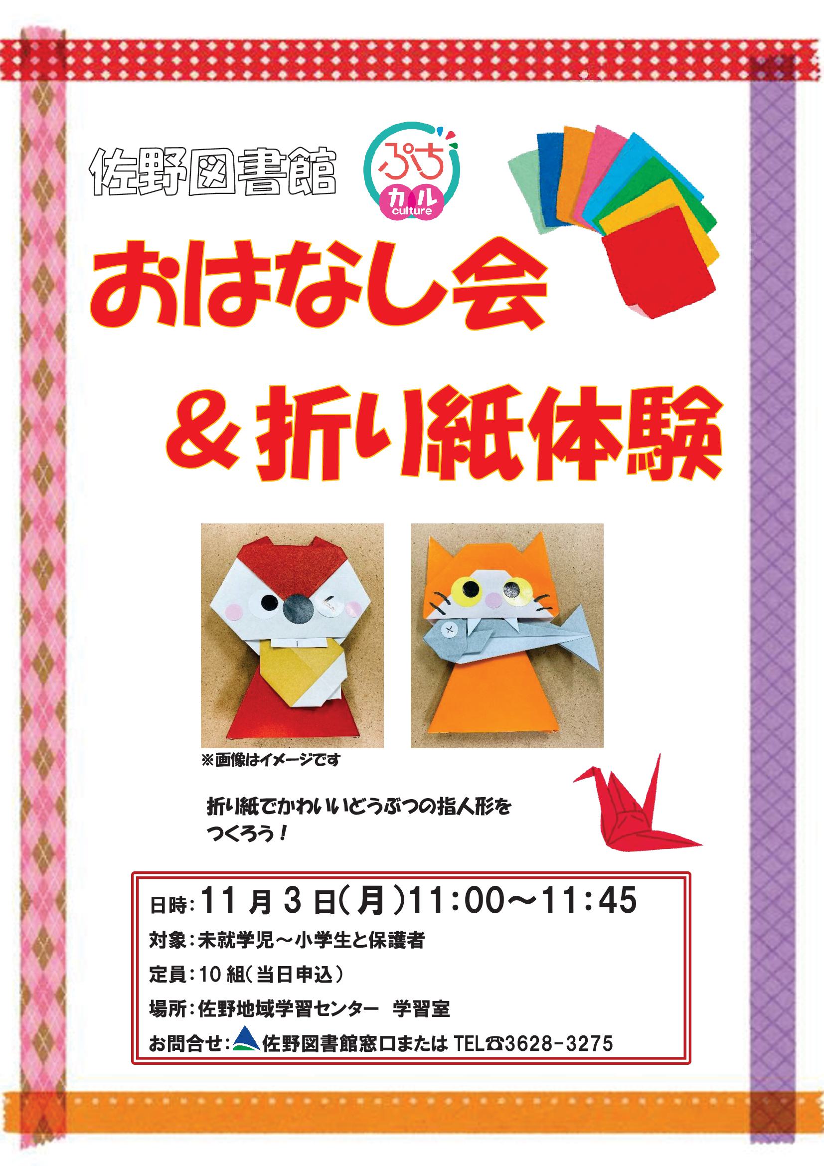 親子で楽しめる折り紙工作ひろばです。動物やお花など好きなものを自由に折っていただいて構いません。持ち物等も特にありませんので、気軽にご参加いただけます。