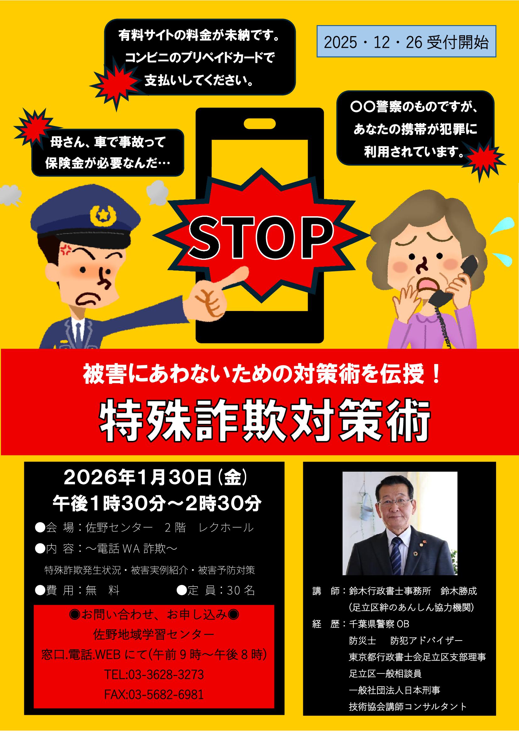 都内では警察官を騙る脅迫めいた詐欺や、身内を騙るオレオレ詐欺や架空請求詐欺などが急増しています。「まさか自分が被害に遭うとは思いもしなかった」と焦る前に、手口を知り、最新対策を講義で学びましょう。