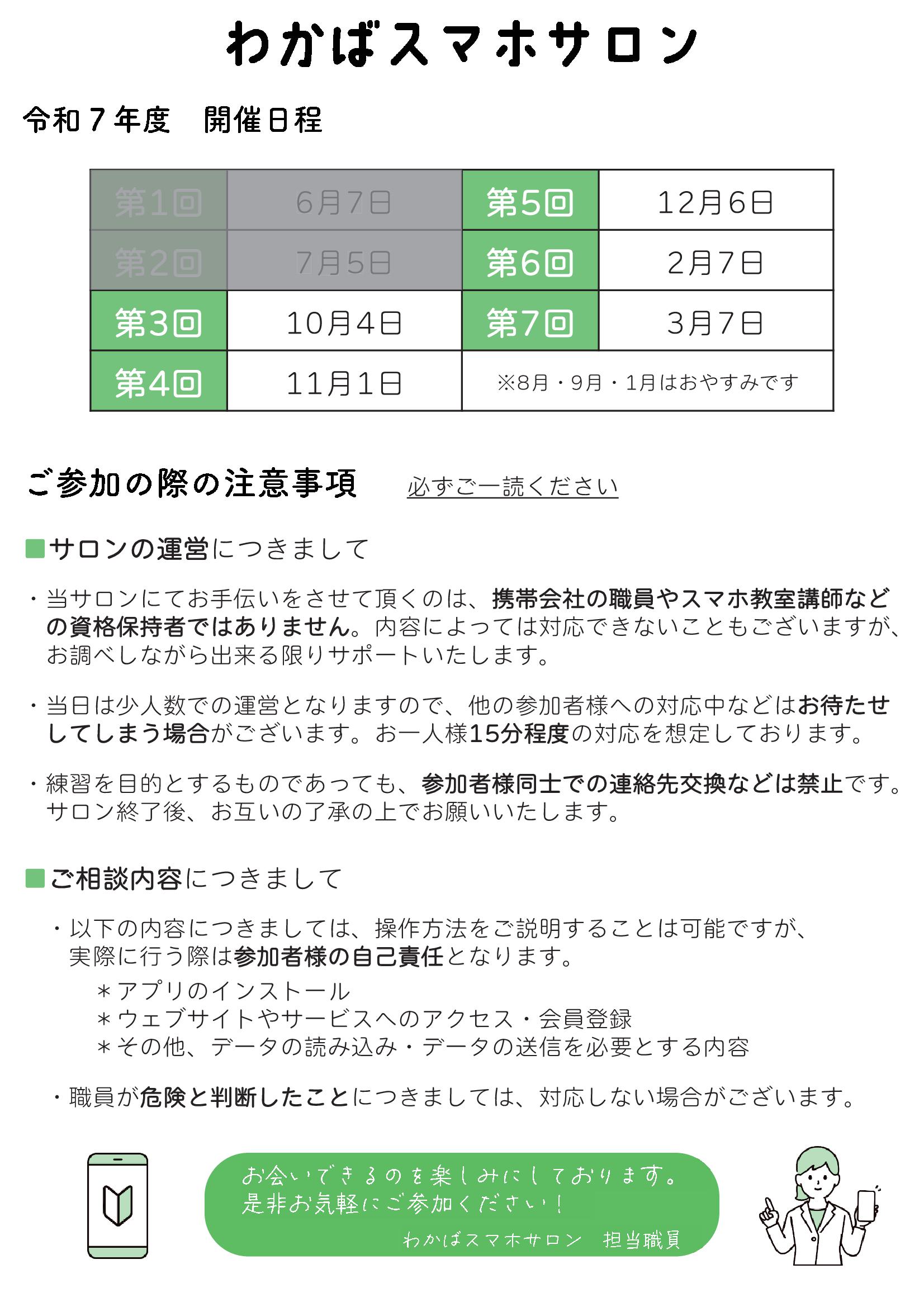 日時 | ①10/6(月)・20(月)・27(月) 午前10時~11時 ②11/10(月)・17(月) 午前10時~11時 |