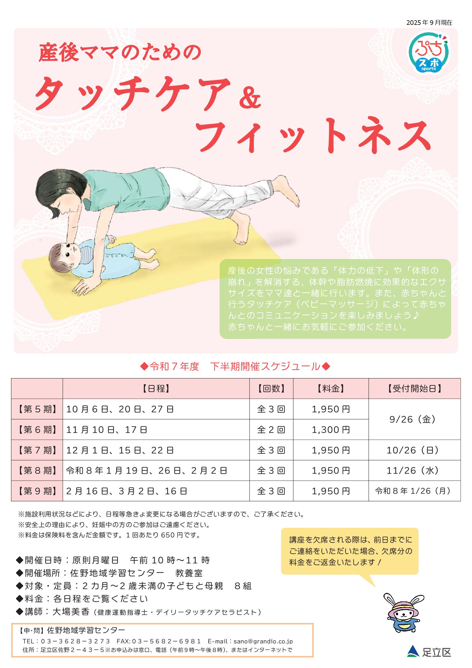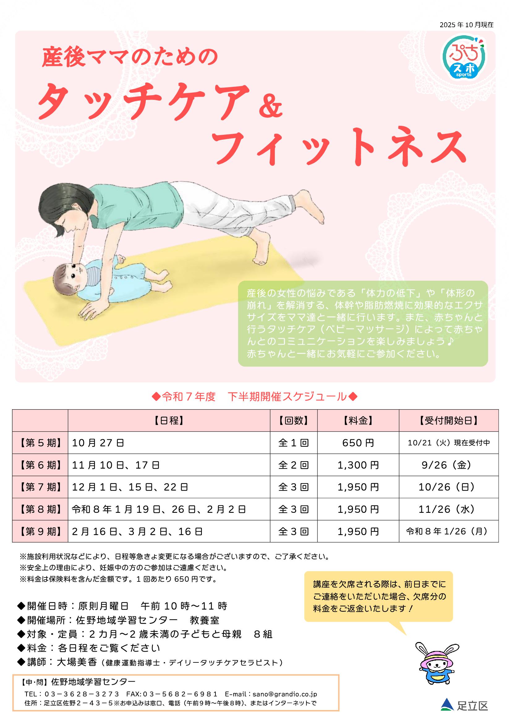 産後の女性の悩みである「体力の低下」や「体形の崩れ」を解消する、体幹や脂肪燃焼に効果的なエクササイズをママ達と一緒に行います。また、赤ちゃんと行うタッチケア(ベビーマッサージ)によって赤ちゃんとのコミュニケーションを楽しみましょう♪