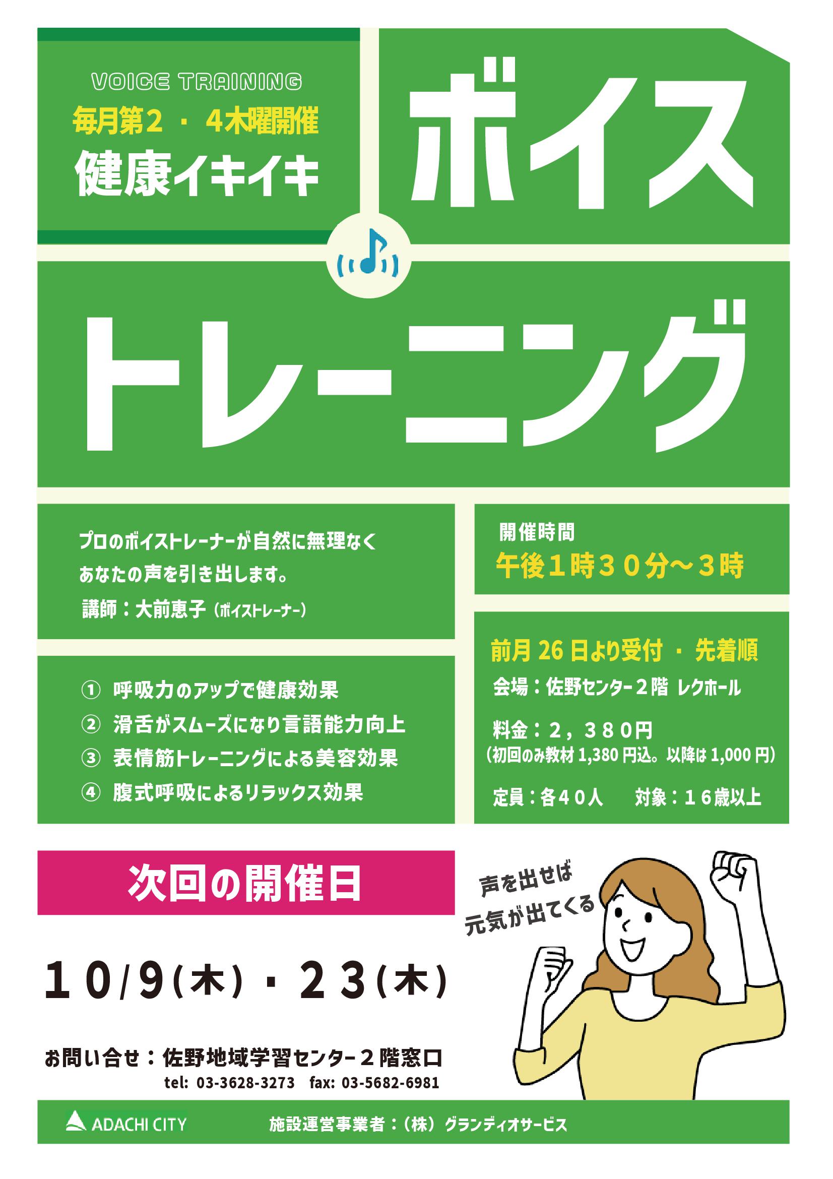 ピアノの生演奏に合わせ、参加者全員で歌謡曲などを唄って発声し、美容と健康づくりを楽しくおこないます。
