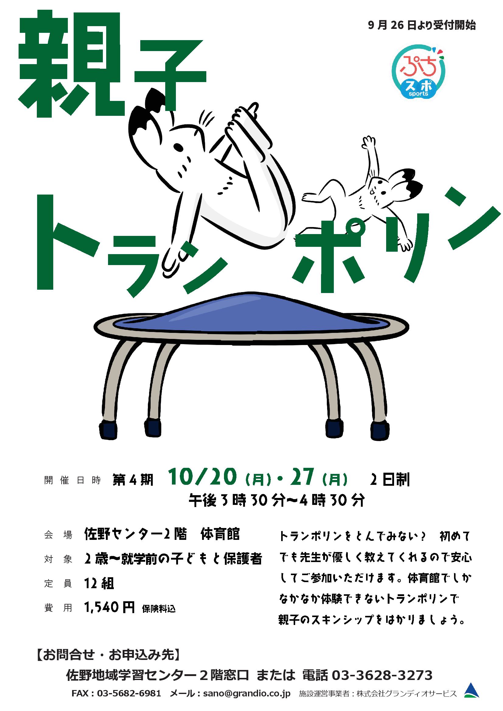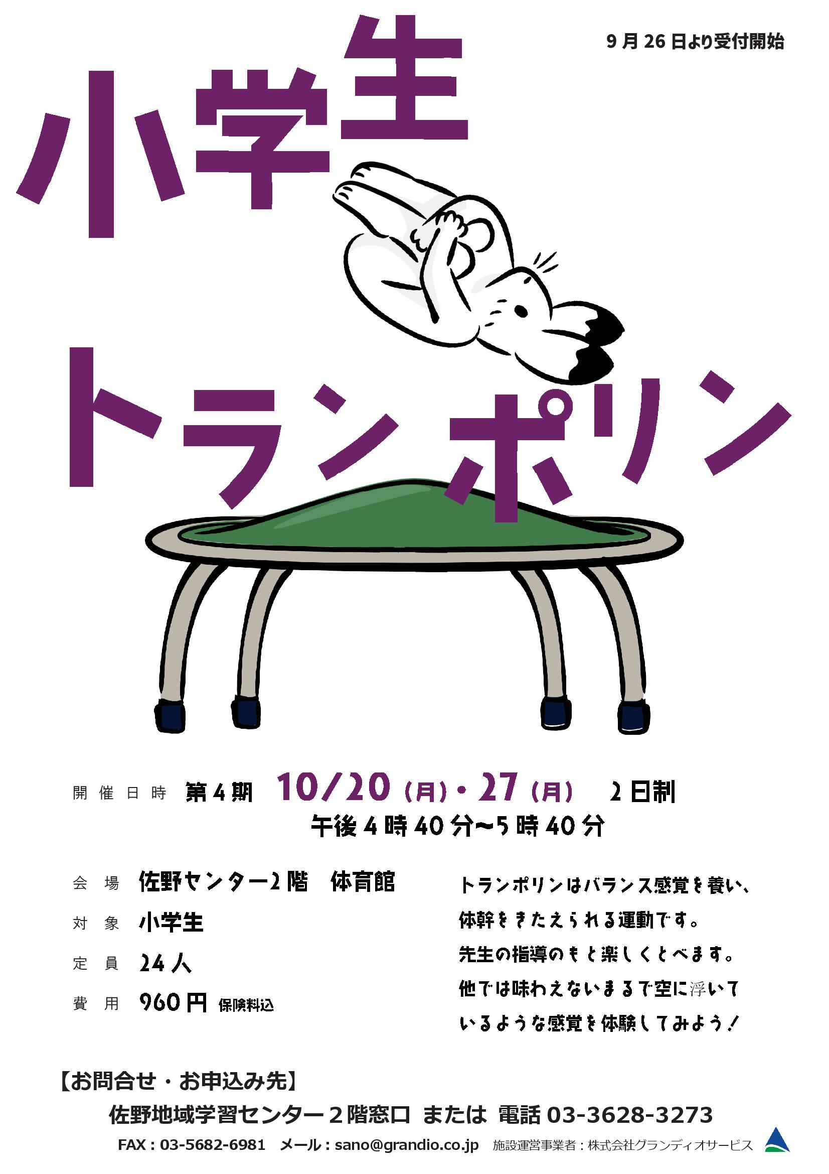 トランポリンはバランス感覚を養い、体幹を鍛える運動です。基本から応用まで先生指導のもと楽しく学ぶことができます。