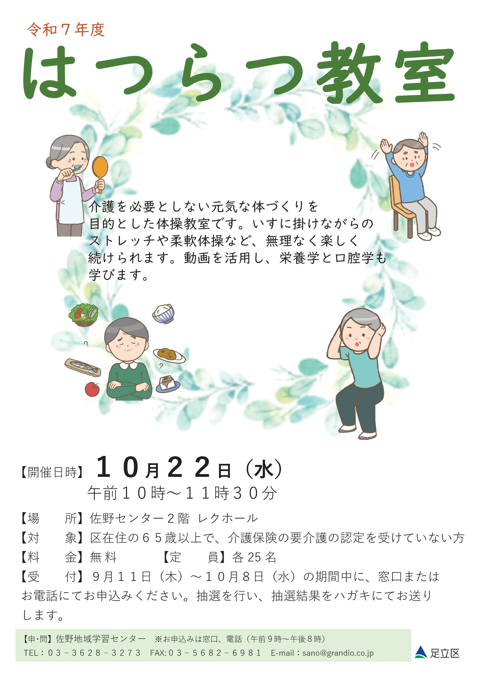 年齢を感じ始めた方に向けた、身体と頭の健康を維持・改善するやさしい体操教室です。ゆったりとした無理のない動きで、ストレッチや有酸素運動、筋トレを行う他、脳トレゲームなども行います。