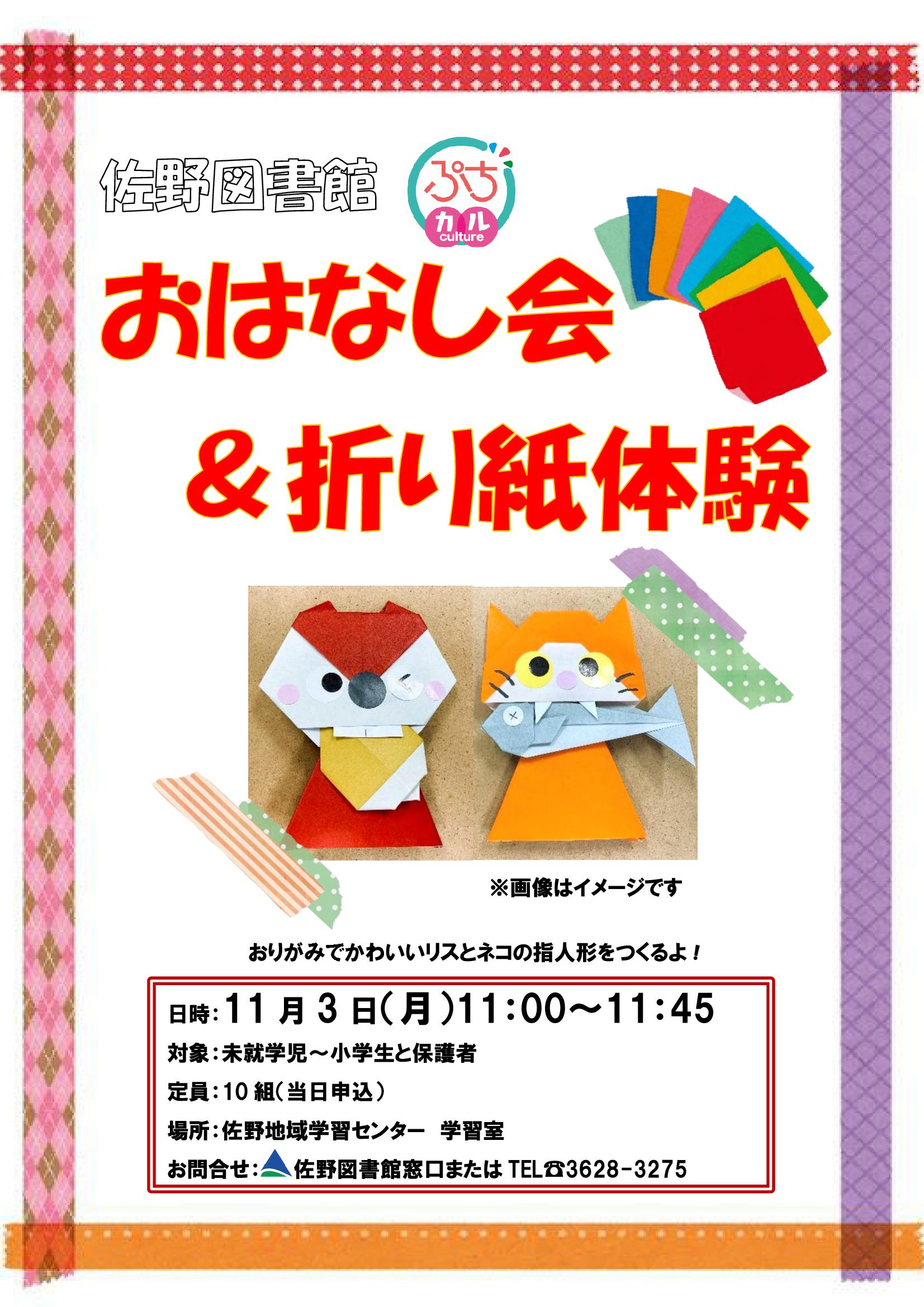 おはなし会の後は、本の内容にちなんだ折り紙体験!かわいいリスやネコを作ります。