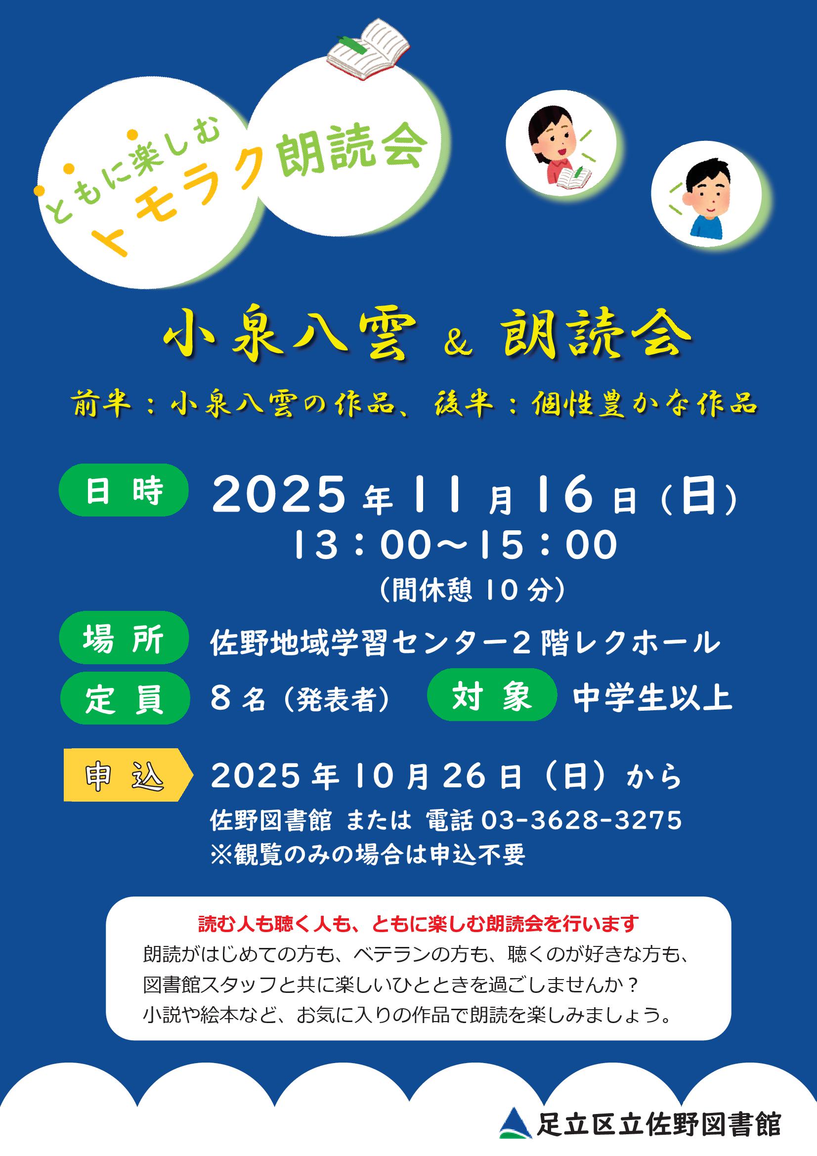 朗読が初めての方も、ベテランの方も、聴くのが好きな方も、図書館スタッフと共に楽しいひとときを過ごしませんか?小説や絵本など、お気に入りの作品で朗読を楽しみましょう。今回は、前半は小泉八雲の作品、後半は個性豊かな作品の朗読をおこないます。