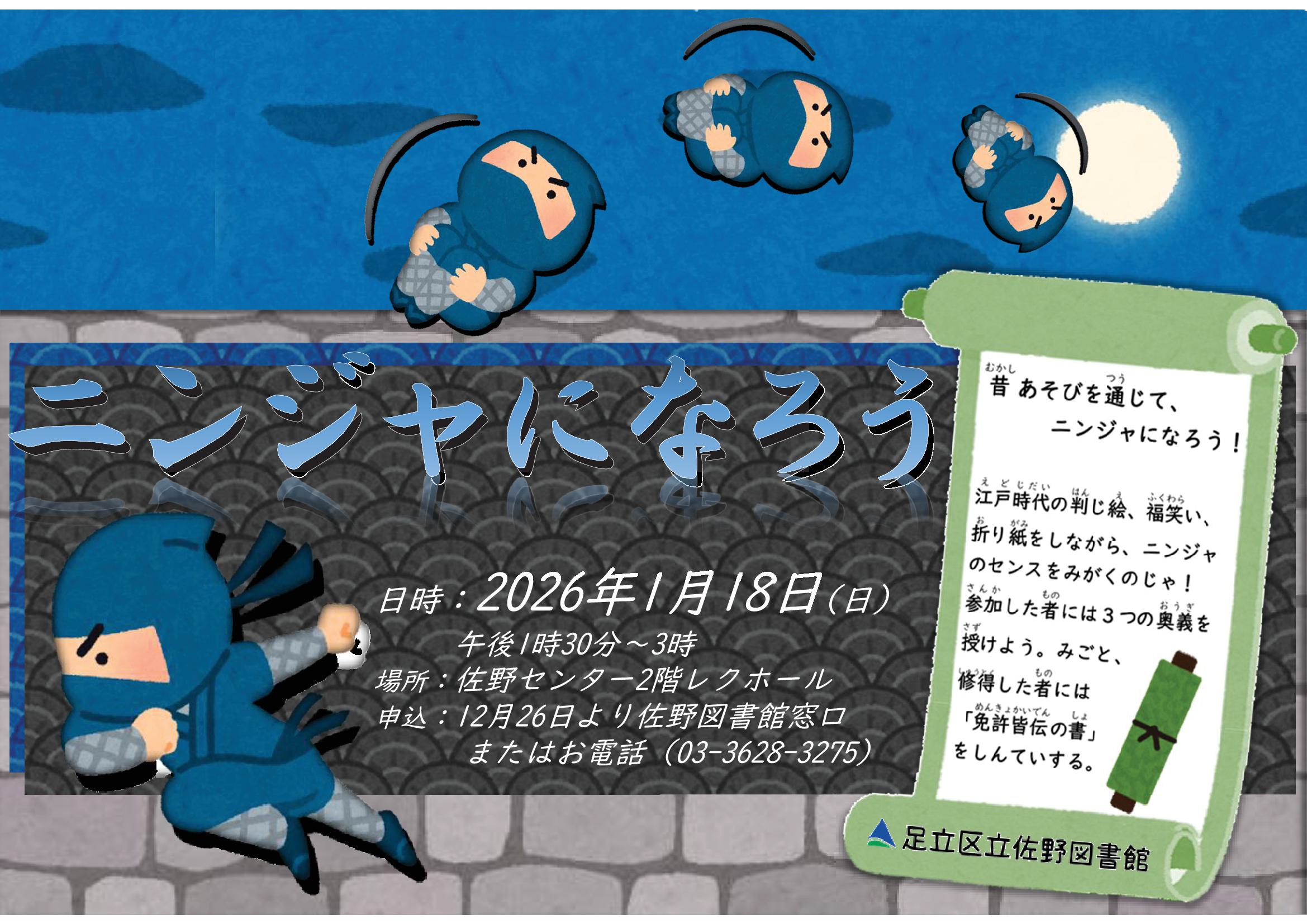 判じ絵や福笑い、折り紙で遊びながら、ニンジャのセンスをみがこう!みごとに三つの奥義を習得した人には「免許皆伝の書」をプレゼント!