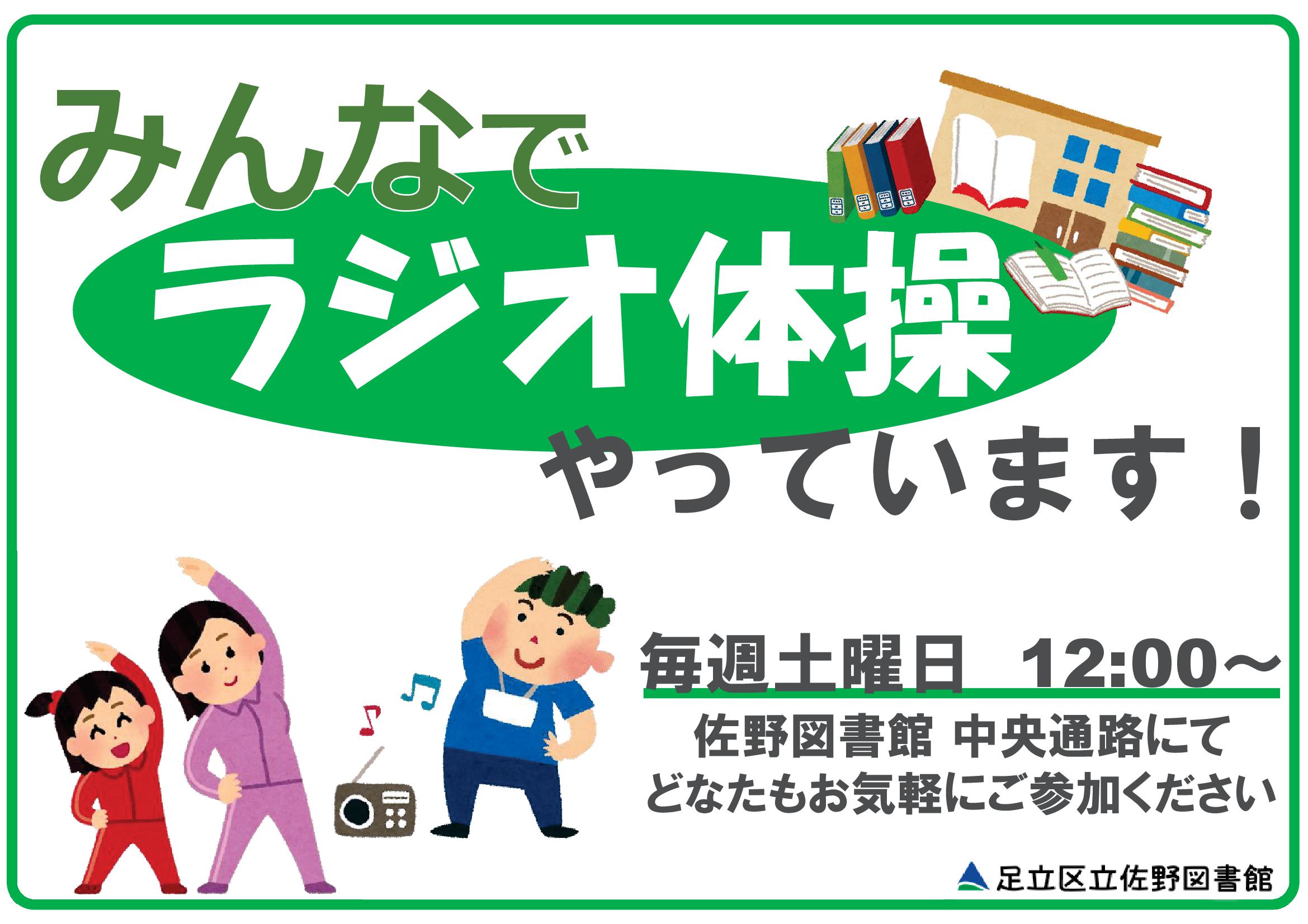 佐野図書館では毎週土曜日12時から、館内中央通路にて「みんなでラジオ体操」をおこなっています。どなたもお気軽にご参加ください。