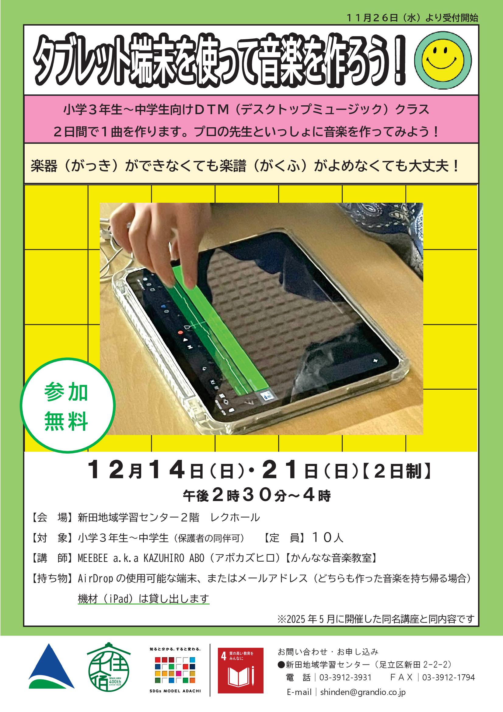 DTM(デスクトップミュージック)作りを体験できる講座です。タブレット端末を使ってプロの先生と一緒に音楽を作ります。