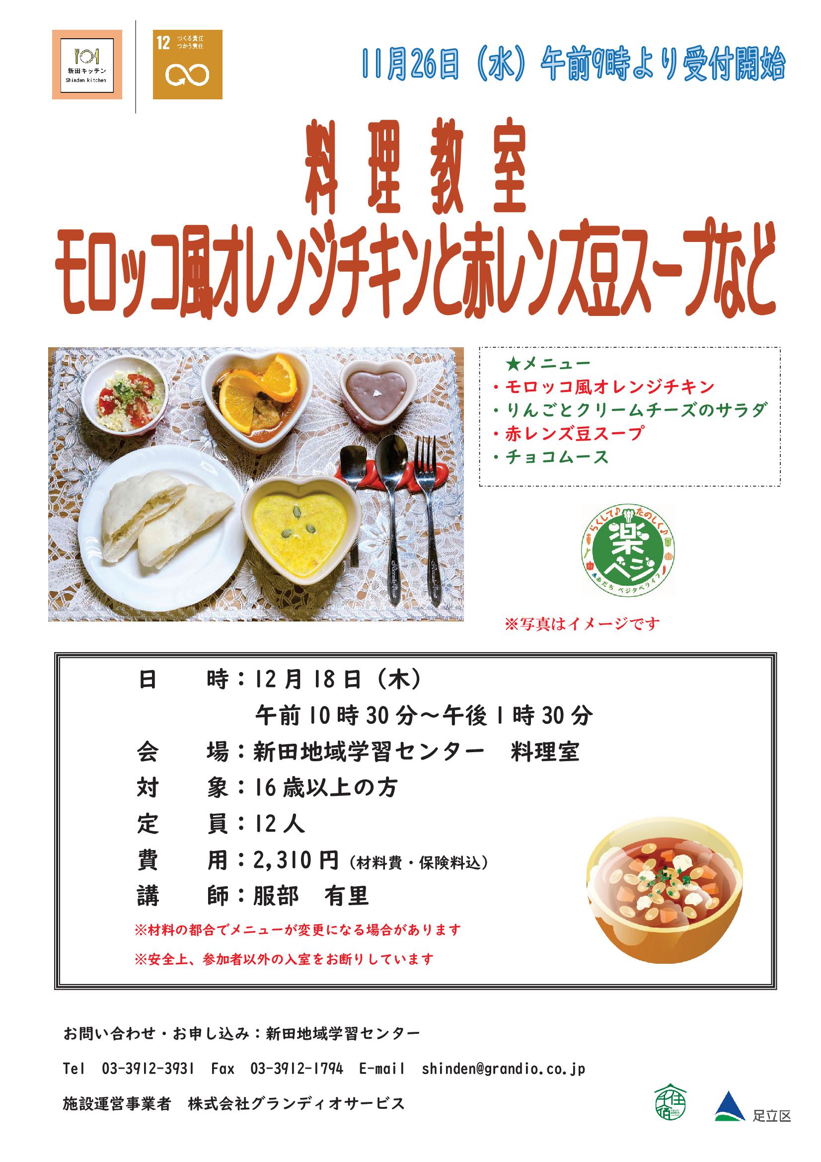 料理教室モロッコ風オレンジチキンと赤レンズ豆スープなど
