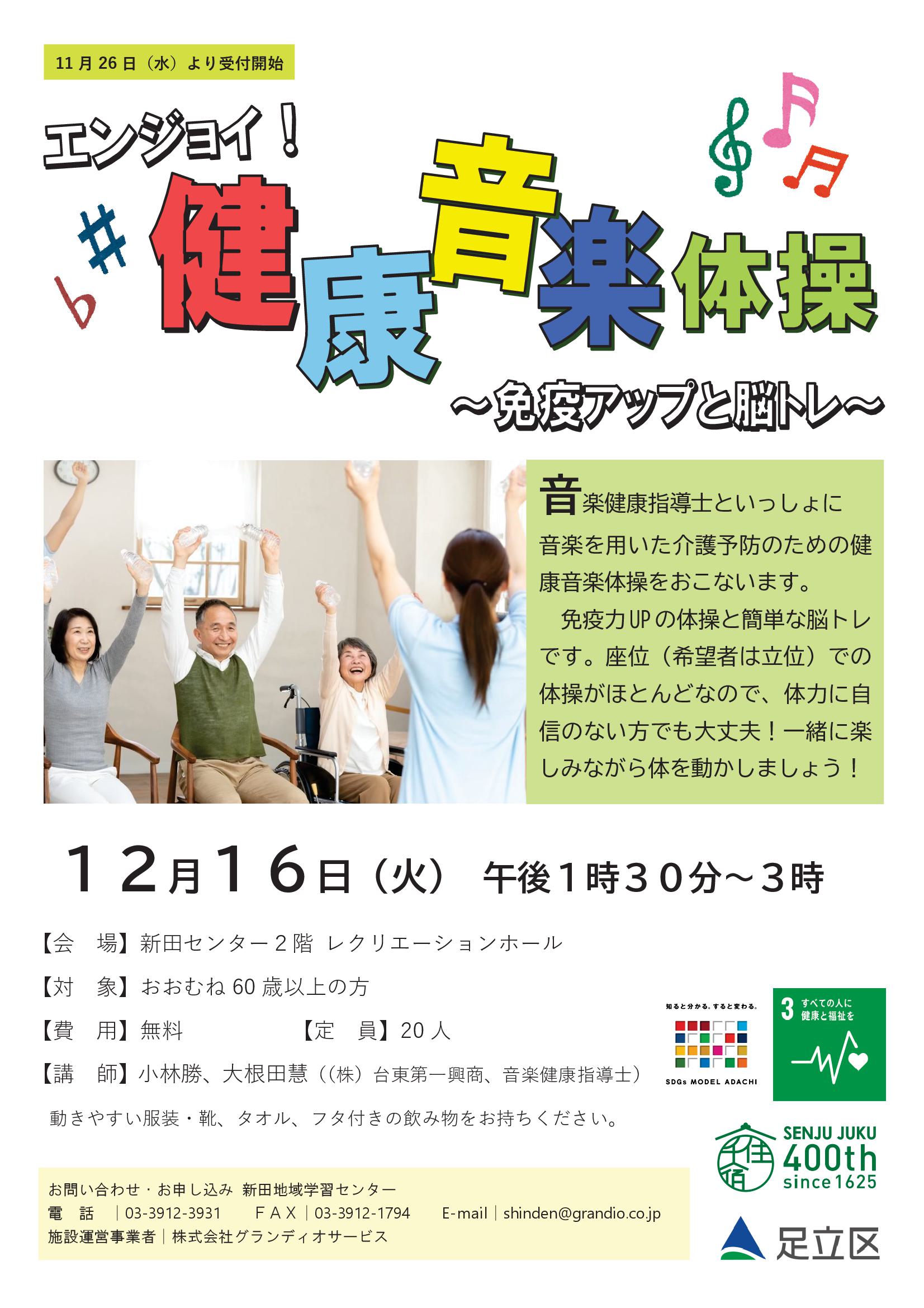 音楽健康指導士の指導のもと、音楽を用いた健康体操をおこないます。座位での体操がほとんどなので、お気軽にご参加ください!