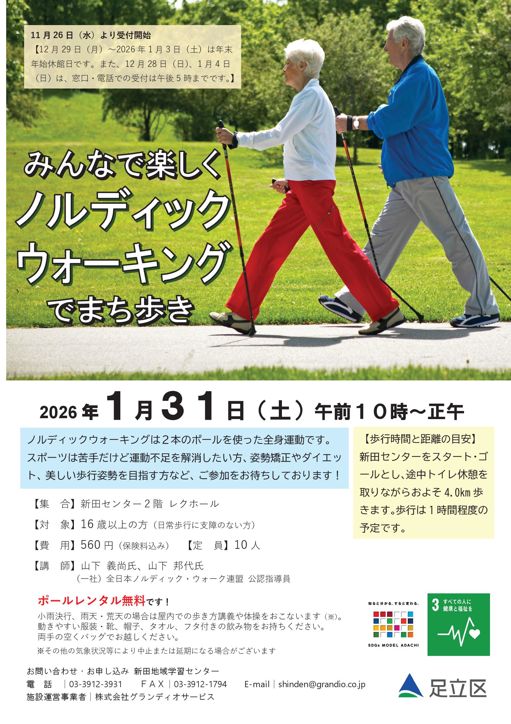 ノルディックウォーキングは通常の歩行と違い、ポールを使うので上半身も効果的に使えます。歩き方の講義の後、実際に1時間程度、新田地域を歩きます。※小雨決行、雨天の場合は屋内での歩き方講義や体操となります