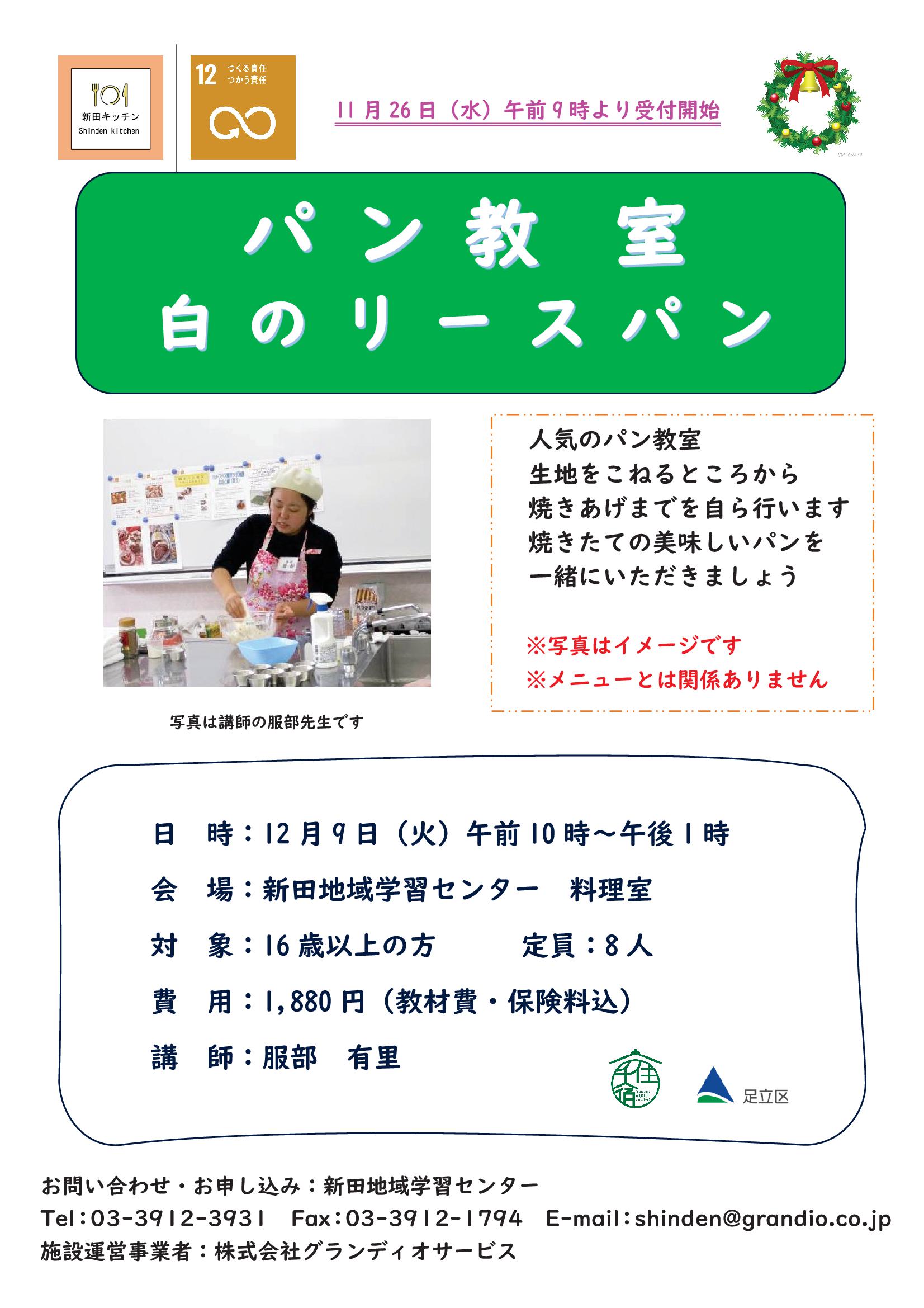 安価な価格で参加しやすく初めての方でも講師が親切丁寧に指導いたします。自分で焼きあげたパンの美味しさは格別です。ぜひ、この機会にパン作りに挑戦してみませんか!今回は、白のリースパンを予定しています。