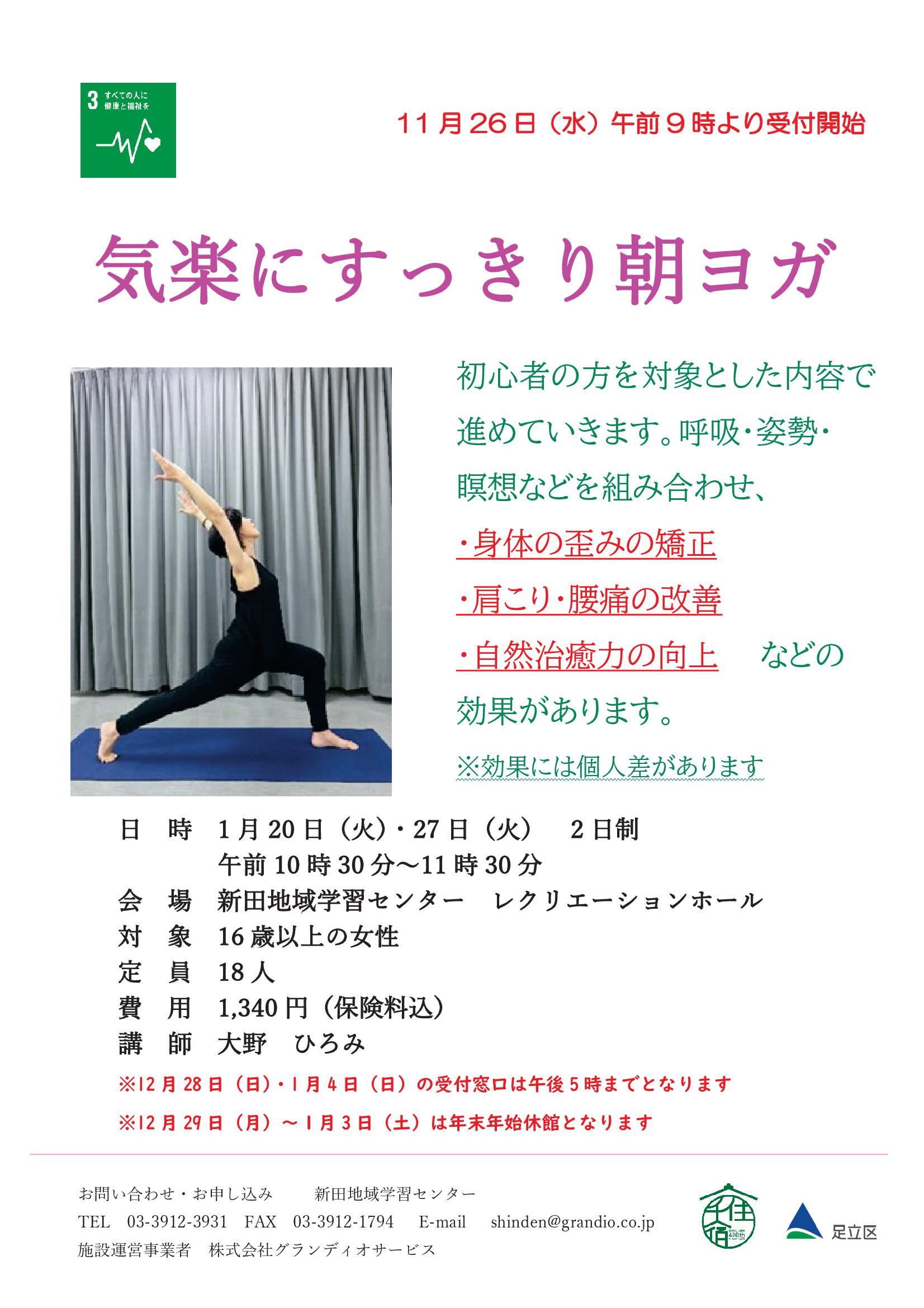 初心者の方を対象とした内容で進めていただきます。お勤めしている方でも参加しやすい夜間の時間帯で開催いたします。ヨガは、呼吸・姿勢・瞑想などを組み合わせて心身の健康を保つことを目的としています。効果としては、個人差はありますが身体のゆがみが直り姿勢が良くなる。自然治癒力が高まる。肩こりや腰痛が改善されるなどがあります。